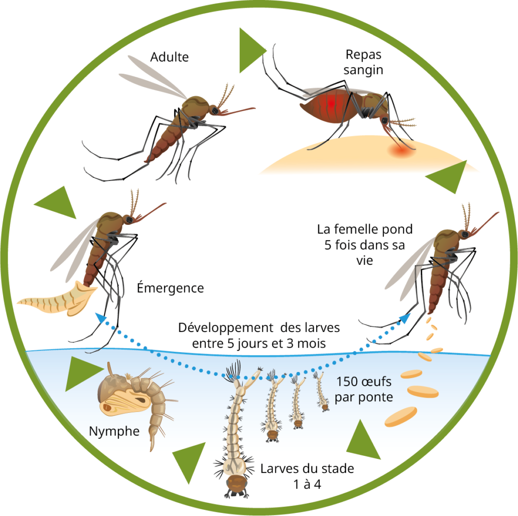 La durée de vie moyenne du moustique femelle adulte est de 2 mois. Le cycle de vie du moustique commence avec la ponte d’œufs par la femelle dans des eaux stagnantes. Les œufs éclosent et donnent naissance à des larves aquatiques qui se nourrissent de micro-organismes présents dans l’eau.